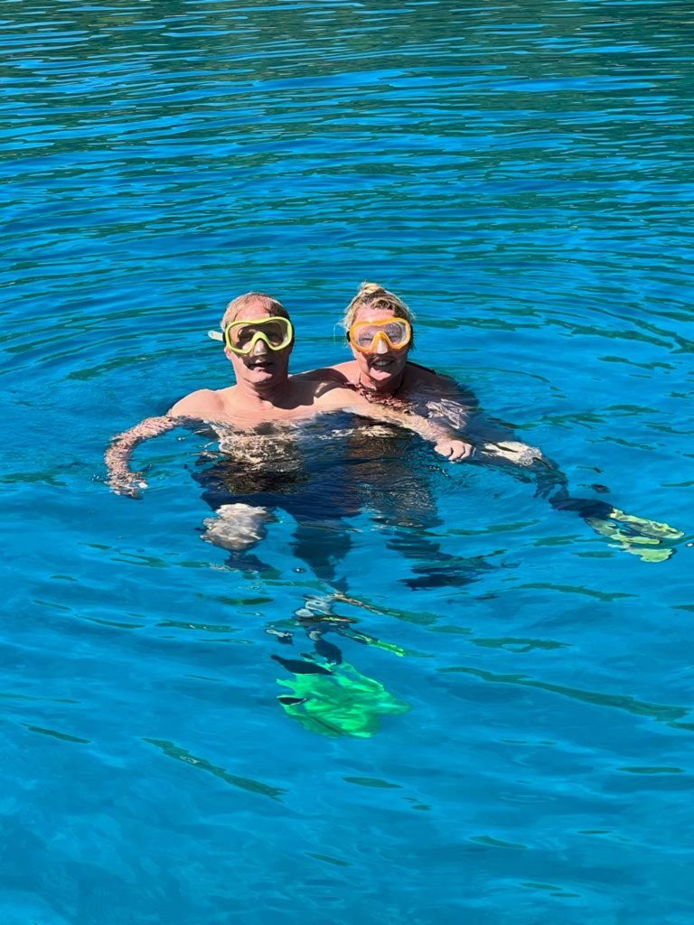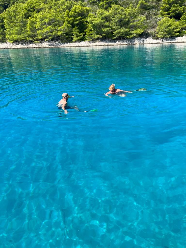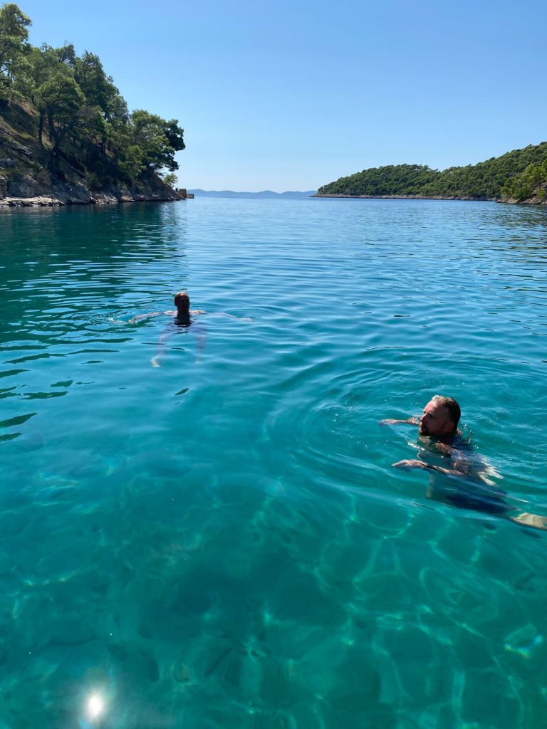 We leggen de boot stil in een prachtige baai en zwemmen in het prachtig mooie blauwe water en genieten van de zon.