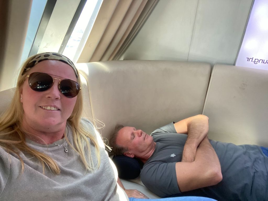 Eenmaal op de ferry gaat manlief languit op een bank liggen en probeer ik ook wat bij te slapen. Door de gigantische airco luchtstroom, hoest ik 2 uur lang de hele weg de longen uit mijn lijf.
