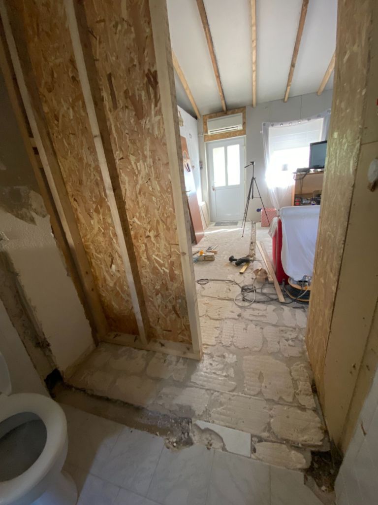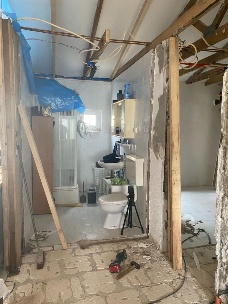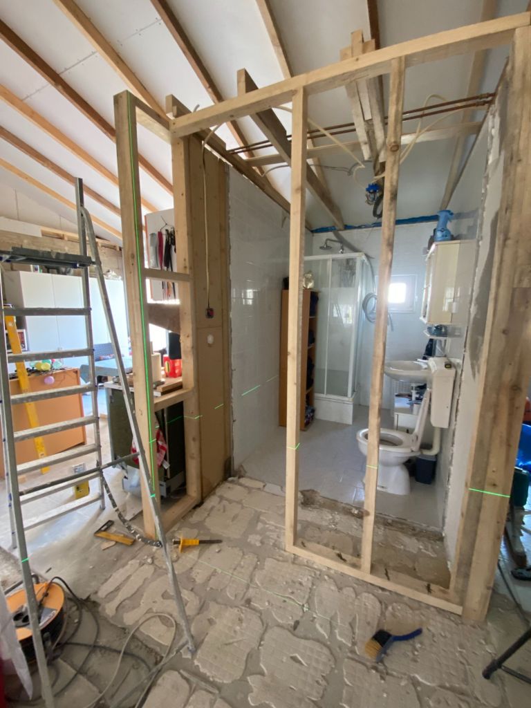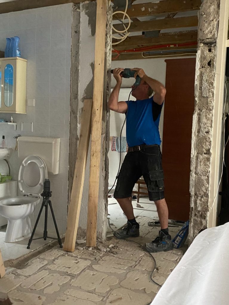 - oude wand badkamer verwijderd, nieuw erin en verzet