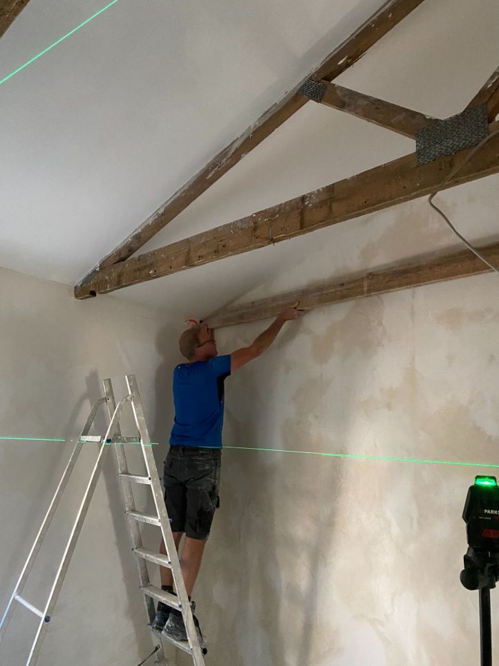 Daarna moeten er tussen de oude balken nog extra nieuwe balken worden aangebracht, zodat er later een vloer op kan worden aangebracht. Dat noemen we de entre sol of de zolder.