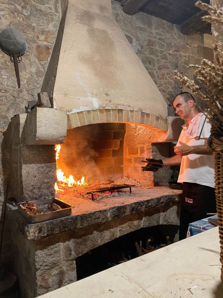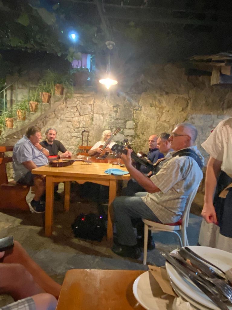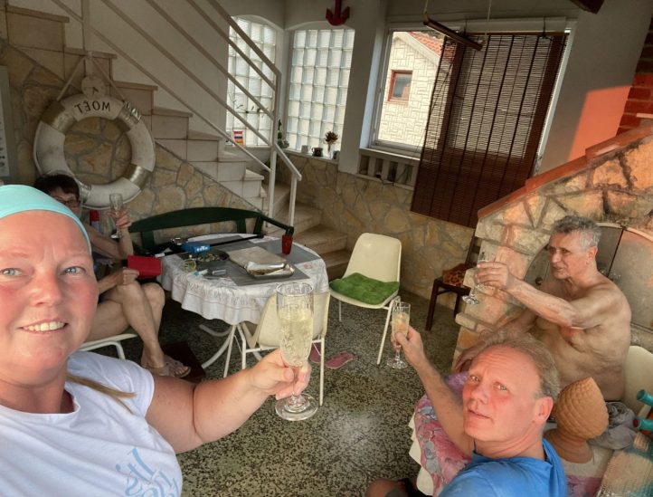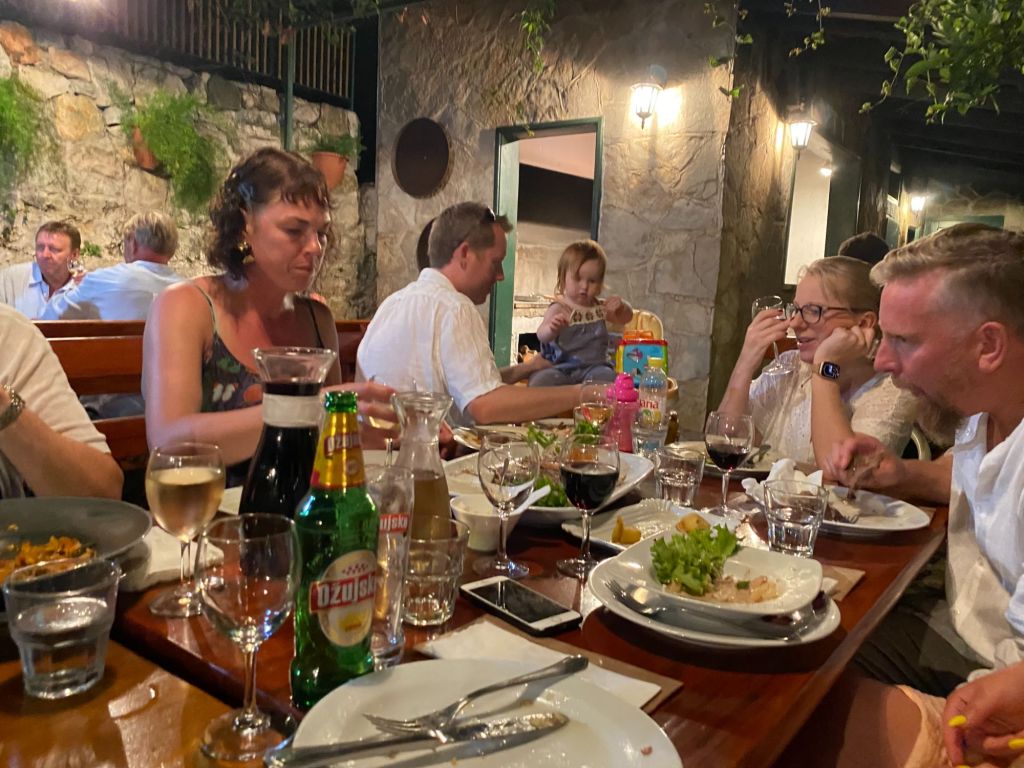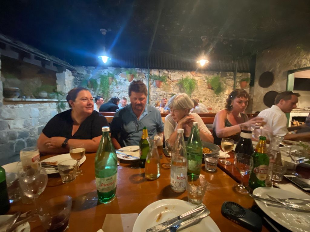 In de avond zijn we uitgenodigd om met vrienden zijn verjaardag te vieren in een restaurant in Pitve Dvordubokovic. Als we aankomen zijn we niet de eerste en is er al een gezellige club mensen.