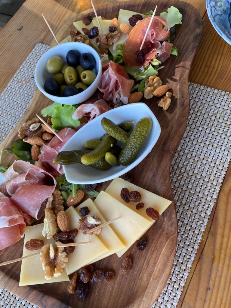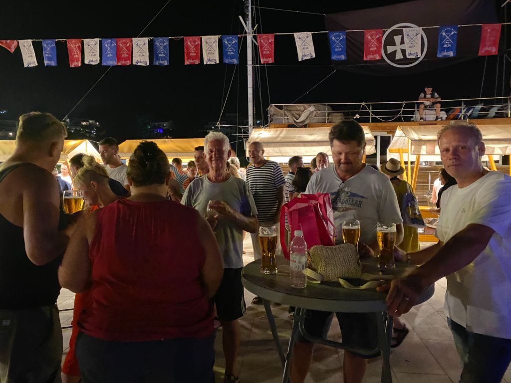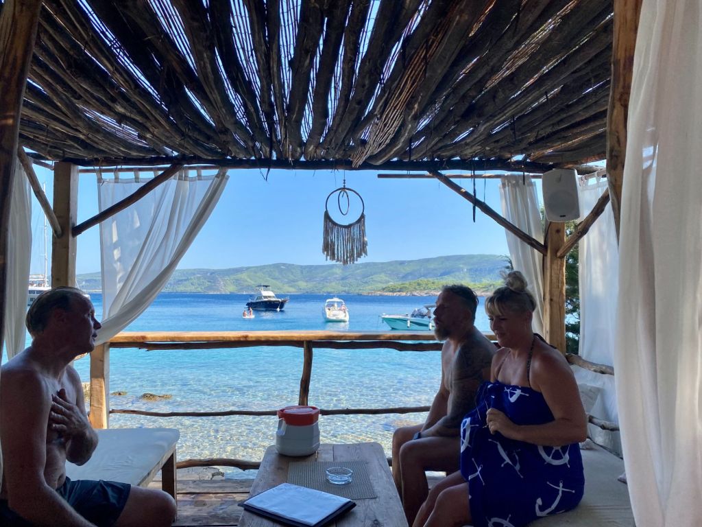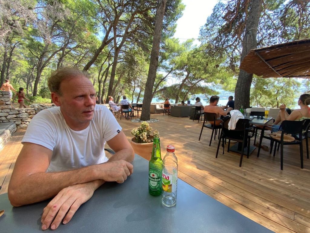 We bestellen een lekkere borrelplank en wat te drinken. Ook spot ik samen met de Broatische Jacque Cousteau dolfijnen. En het kost ons heel wat overredingskracht om de andere 2 te overtuigen dat we toch echt dolfijnen zien, maar uiteindelijk geven ze toe. Althans misschien alleen om van ons gezeik af te zijn.