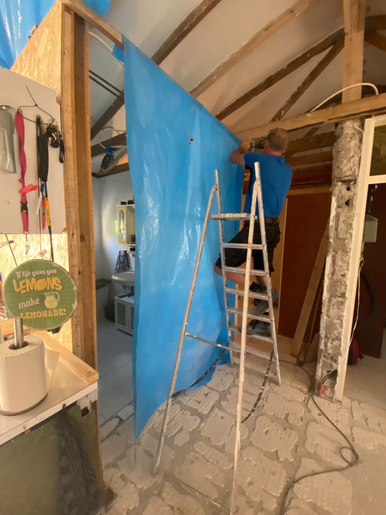 Ook hangt manlief nog even een laken voor de wc, want we hebben nog geen deur sinds de muur verplaatsing.