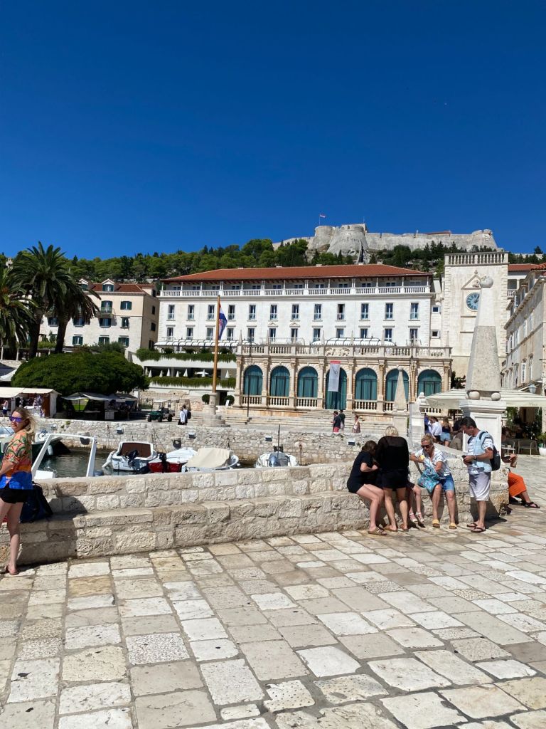 We gaan de volgende dag samen naar Hvar stad even lekker mensen kijken vanaf een terras aan de riva BBClub. Het is er gezellig druk en toeristen komen af en aan. Dat is onze toekomstige doelgroep grappen we.