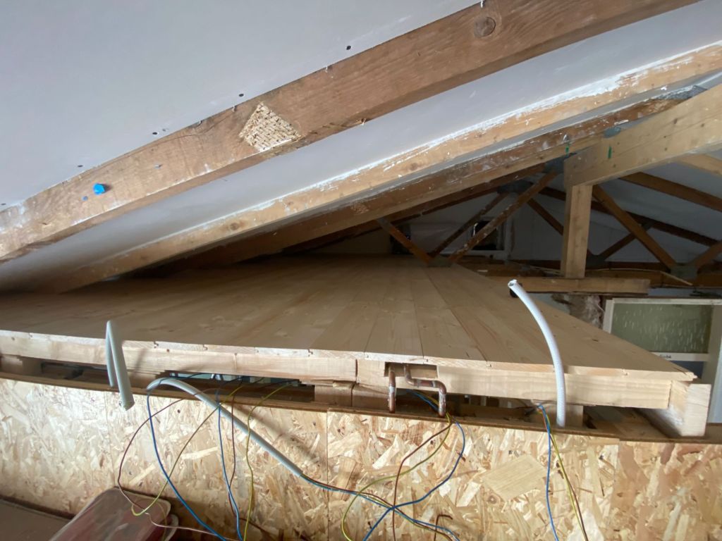 De volgende dag wordt er uiteraard weer hard gewerkt. De extra balken worden geplaatst en er wordt een begin gemaakt met de elektra en vloer boven badkamer. Het is het zelfde riedeltje als de klus van onze slaapkamer van dagen ervoor.
