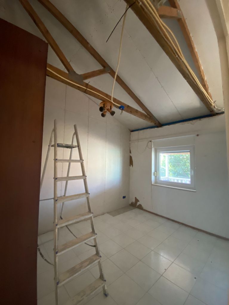 De voorslaapkamer is nu leeg en ook daar kan het stuuk festijn beginnen. Manlief heeft de slag te pakken en het gaat nog sneller dan de vorige ruimte.