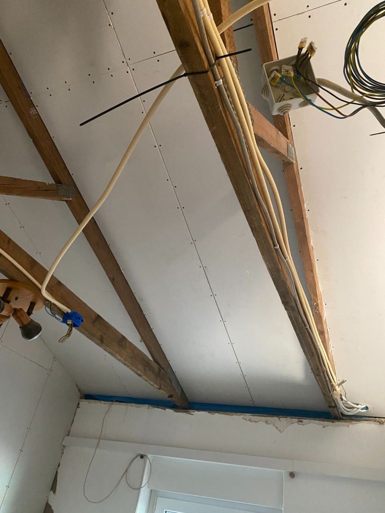Het eerste plafond (in de onze toekomstige slaapkamer, de oude keuken) ziet er piekfijn uit. Super trots ben ik op manlief die echt top klus heeft geleverd.