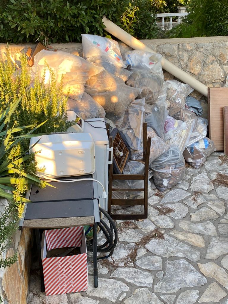 Alle rommel wordt bij het vuilnis op de oprit gezet. En zo krijgen we ineens weer een beetje ruimte en overzicht in de tent.