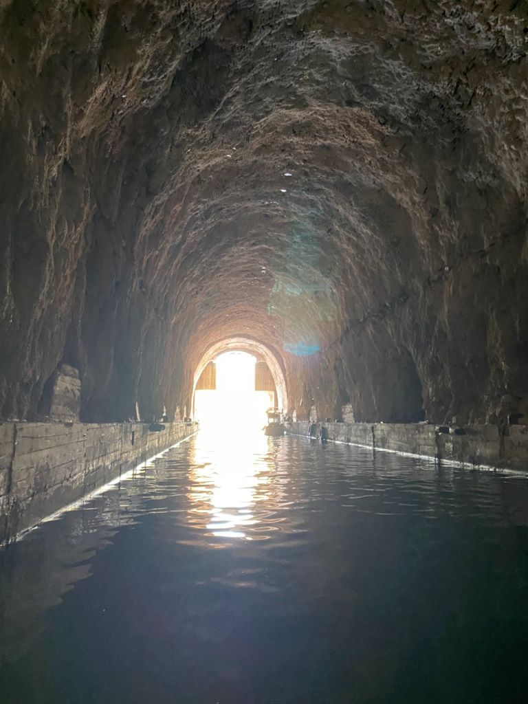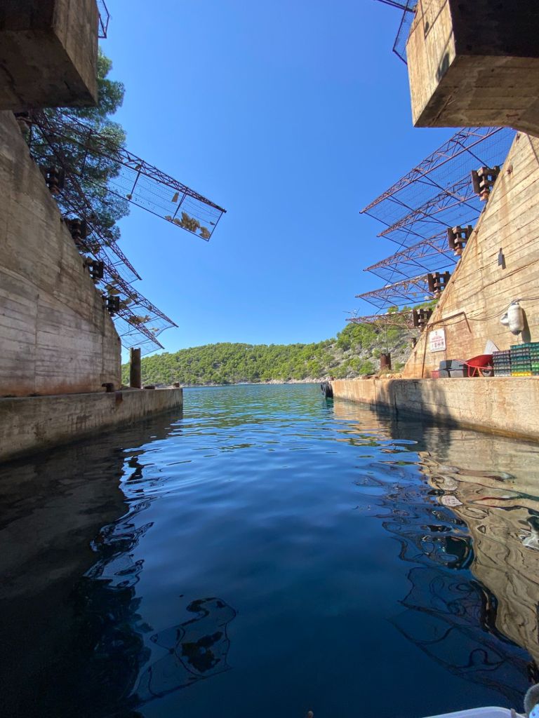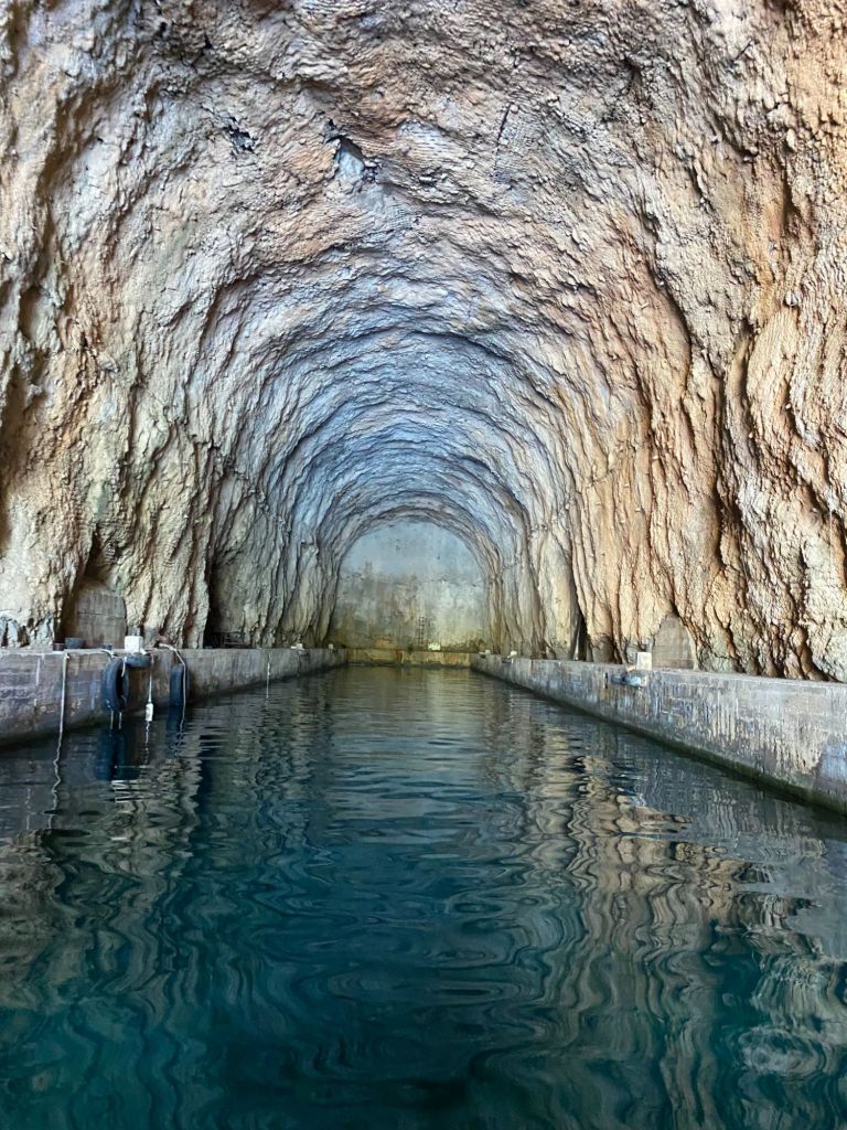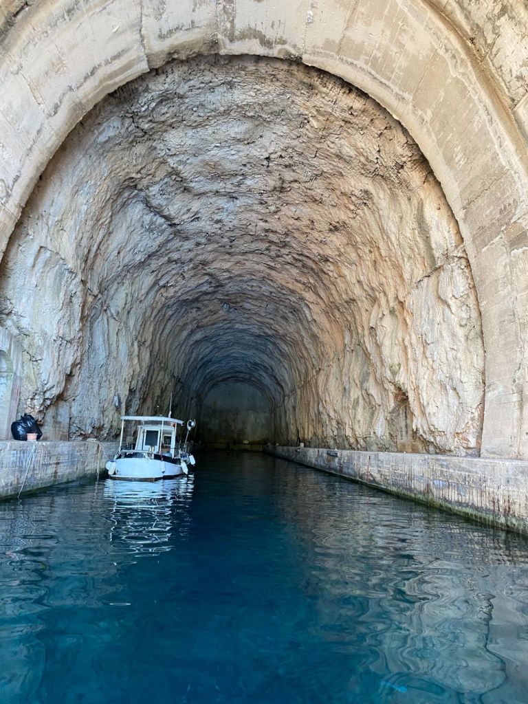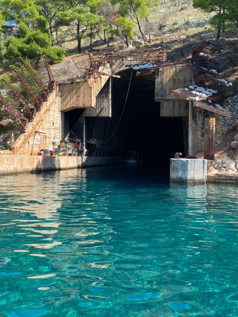 Na een tijdje varen we door naar het eiland Brač, waar we naar de oude voormalige onderzeeër tunnel varen. Met de boot kunnen we de tunnel invaren. Het doet een beetje luguber aan, als je je beseft wat hier in de jaren 90 heeft plaats gevonden.