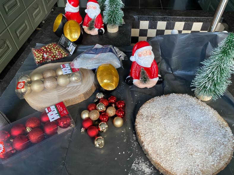 Ik heb bij de Action een lijmpistool gekocht van nog geen 3 euro en spuitlijm, kerstsneeuw in een zakje en wat decoratie spulletjes.