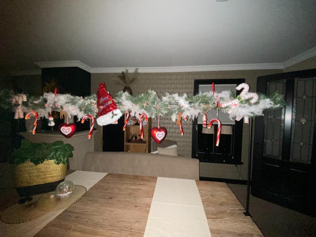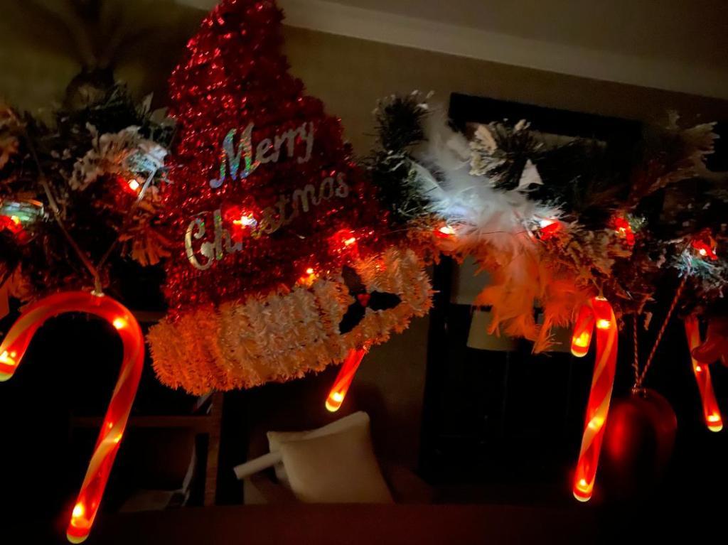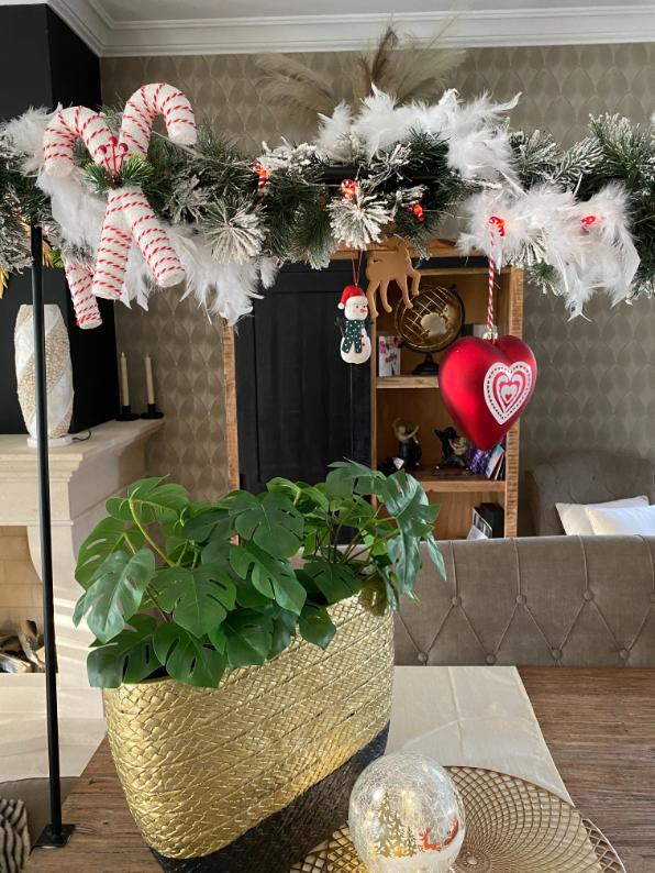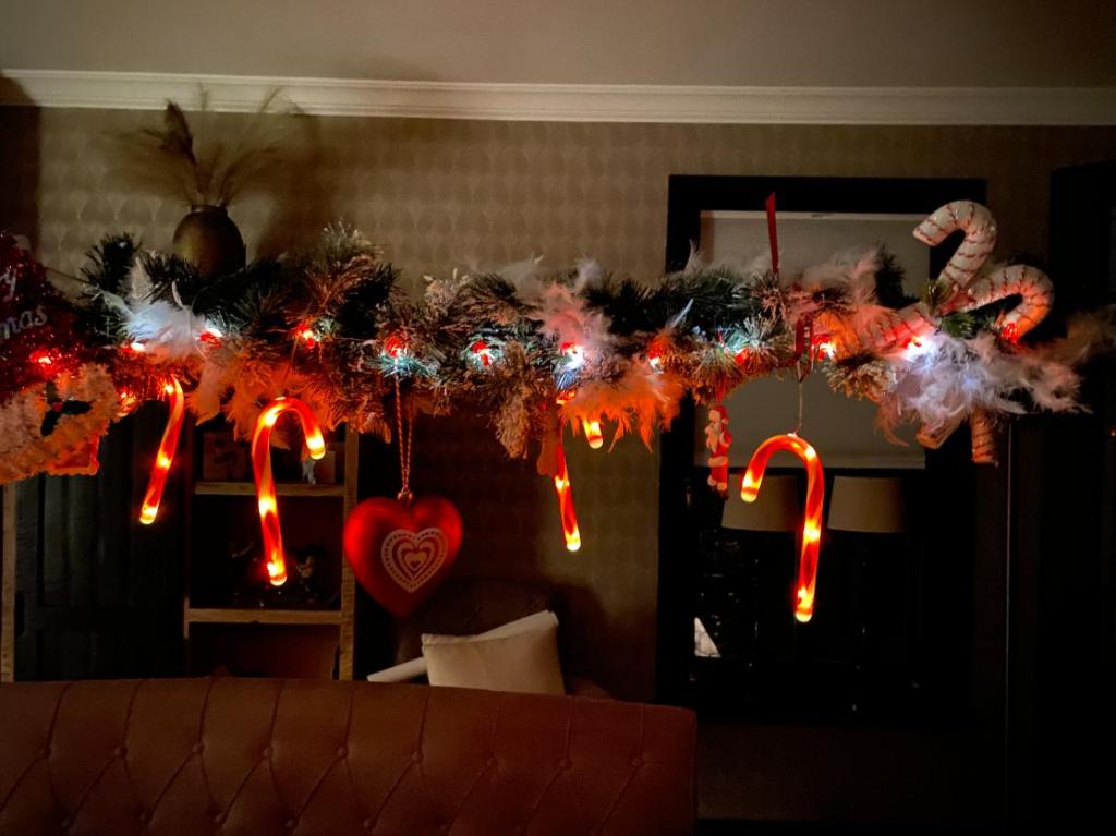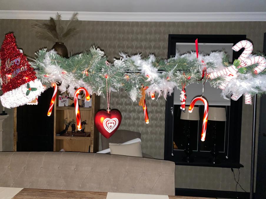 Versierd met een guirlande, veren boa. lichtjes en wat kerst spulletjes.