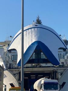 We moeten even wachten en dan zie ik, als ik omhoog kijk, dat de Kapitein ook helemaal in de kerstsfeer is! Hij heeft zijn boom voor op de boeg geplaatst. Zullen er ook kadootjes onder liggen ?