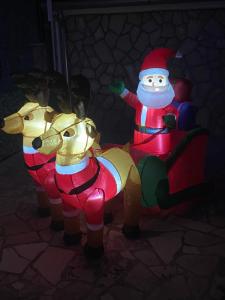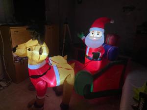 Er staat een mega verlichte kerstman op een arrenslee in de woonkamer.