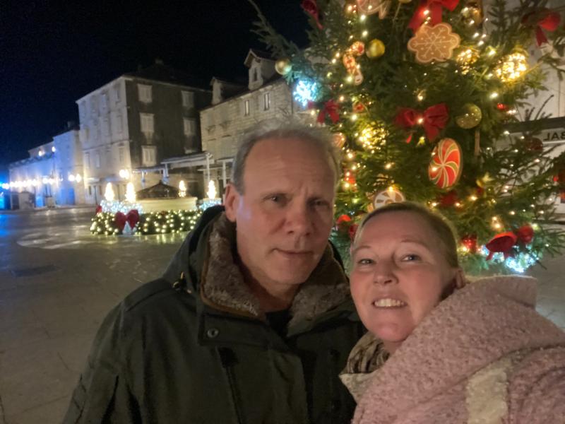 De kerstman en vrouw leggen de kadootjes voor vertrek onder de boom in Spaarndam. En bij ons staat dan ineens uit het niets een tas met kadootjes die we meenemen en in Vrboska onder de boom leggen.
