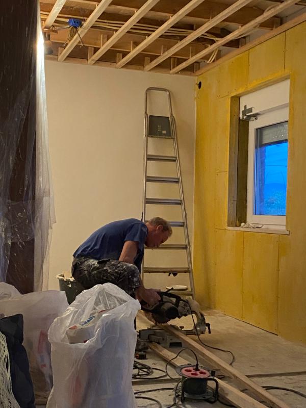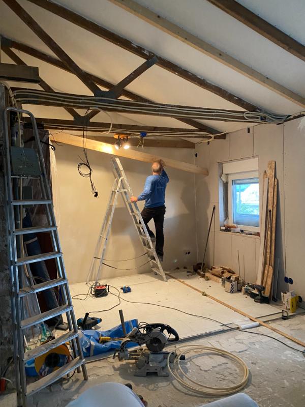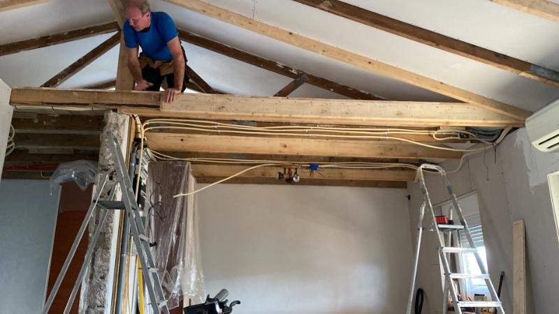 Manlief is ondertussen binnen bezig met een aantal extra balken bij te plaatsen, waarop een vloer kan worden gelegd.