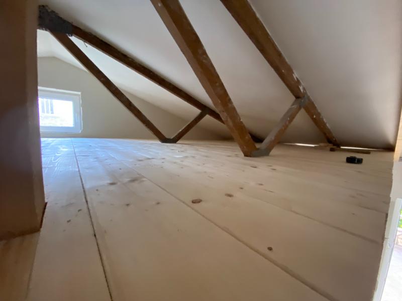 Ook worden er nog meer balken geplaatst en daarop de vloerdelen voor onze entre sol/zolder. En als alle vloerdelen er uiteindelijk op liggen kunnen we niets anders dan trots op onszelf zijn. Klus geklaard, vink af!