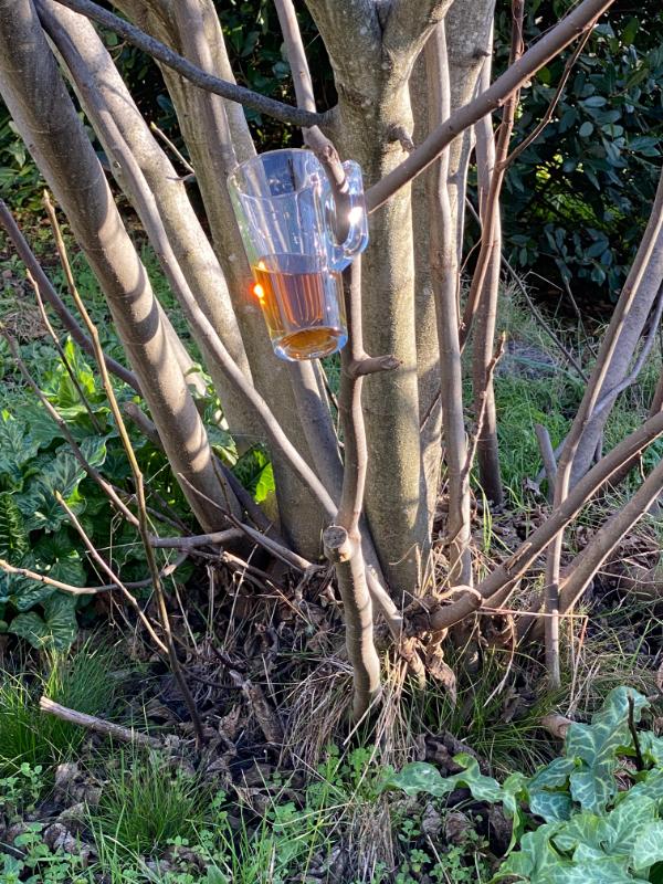 Het overbodige hout wordt door mij verbrand in de tuin onder het genot van een kop thee. En ja daar hangt inderdaad mijn kop thee in de boom. Tegen ongedierte en brutale katten.