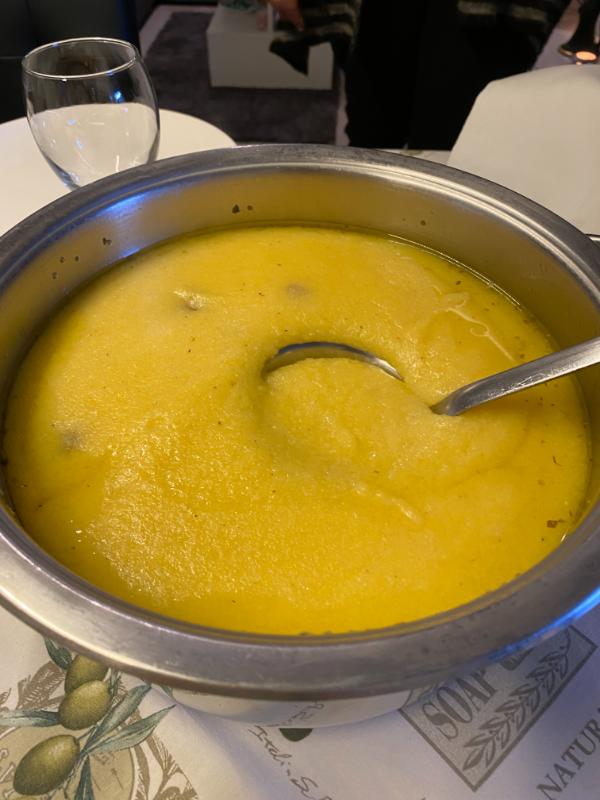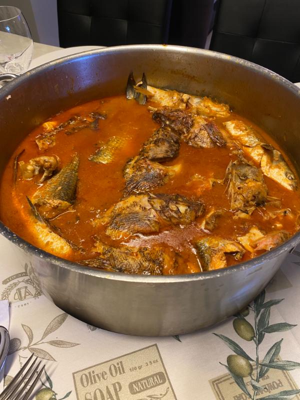 Ze hebben een traditioneel gerecht gemaakt, Brodetto met polenta. Brodetto is eigenlijk een soort van visstoofschotel in een overheerlijke saus (in dit geval met wijn erin verwerkt) polenta is een graan dat vermalen kan worden tot een soep of een puree. In dit geval een puree.