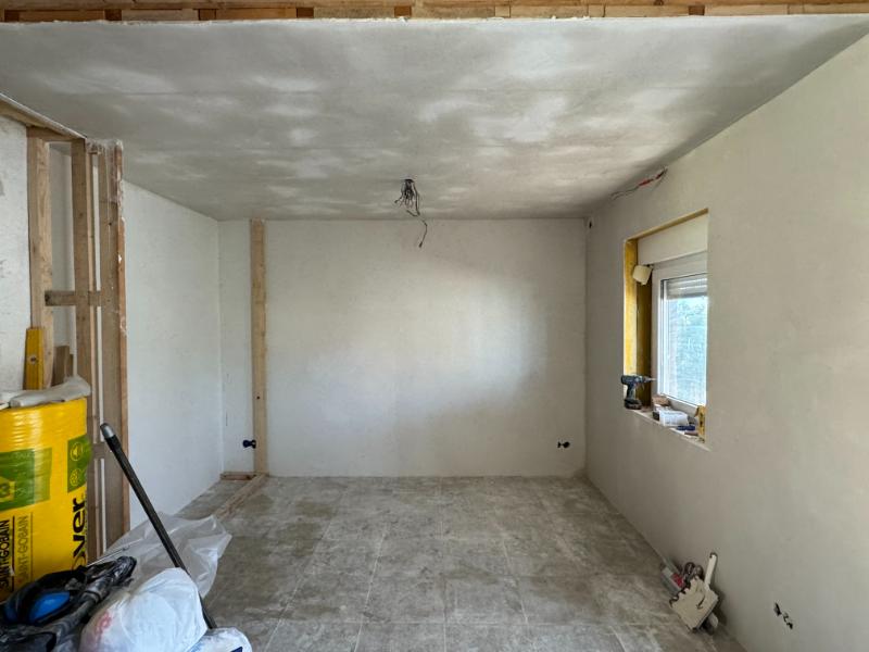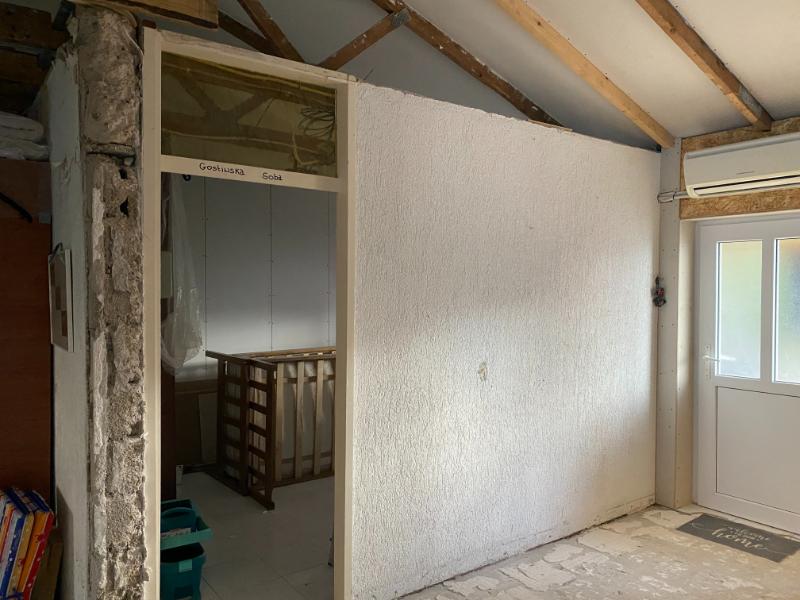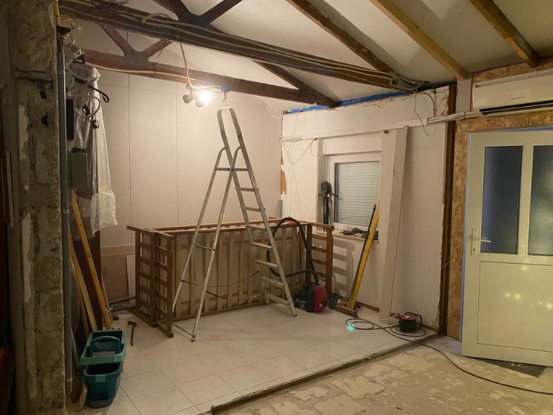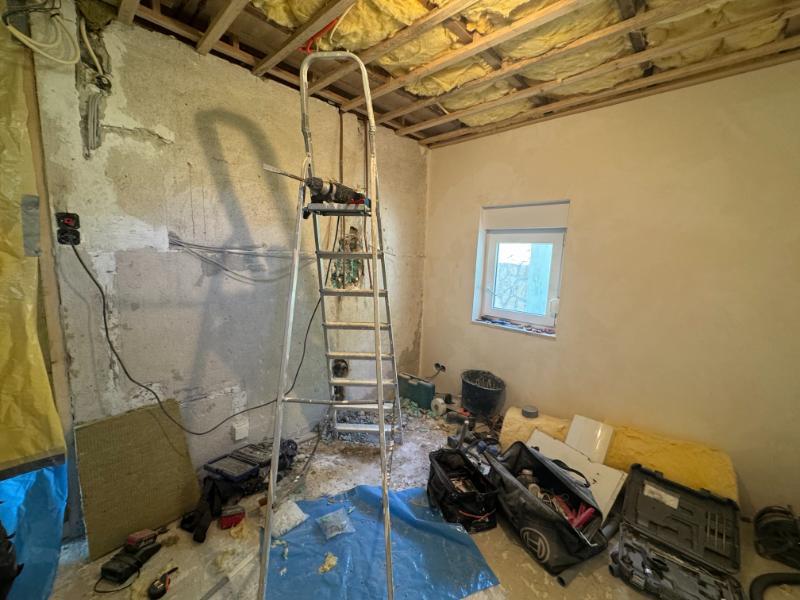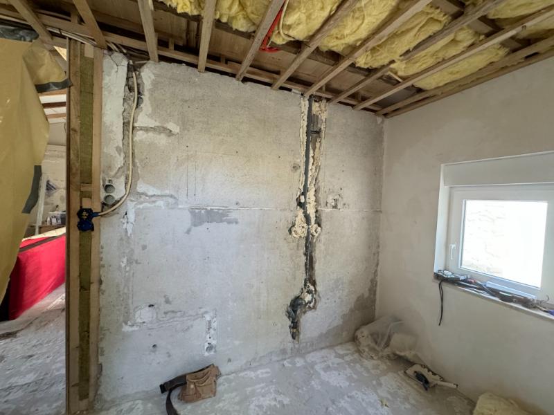 We wilde wat meer ruimte creëren in de woonkamer, die meer in gebruik zal zijn dan een extra slaapkamer, dus hoppa, muur eruit en daarvoor in de plaats gaan we een glazen draai schuifwand terug plaatsen.