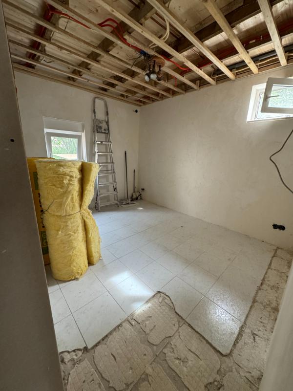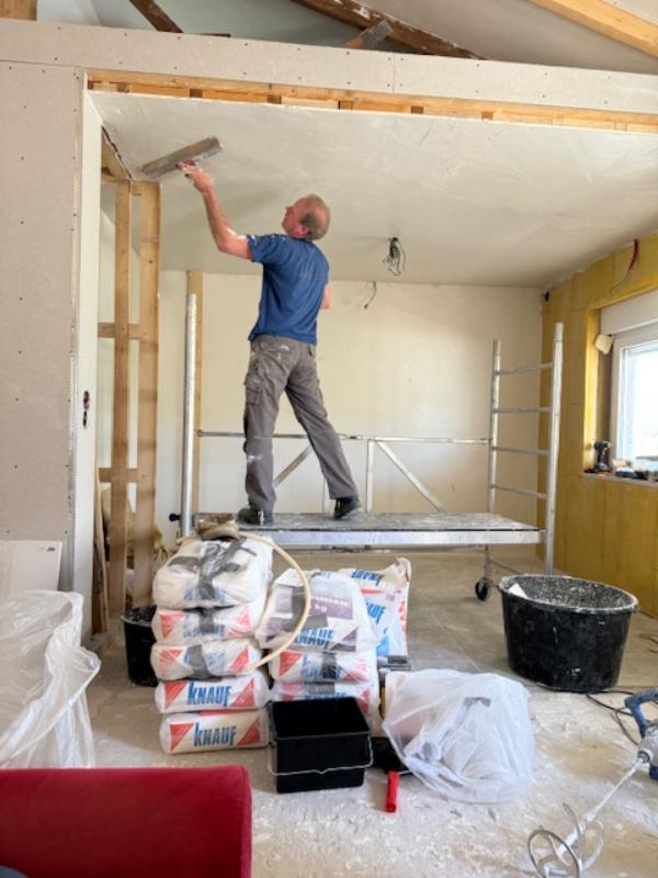 Vandaag gaan we het plafond in onze slaapkamer isoleren en de gipsplaten er tegen aan schroeven. Zo dat ziet er nu al anders uit. Daarna smeert manlief de muur af in de slaapkamer en echt ik moet zeggen wat een wereld van verschil !!!