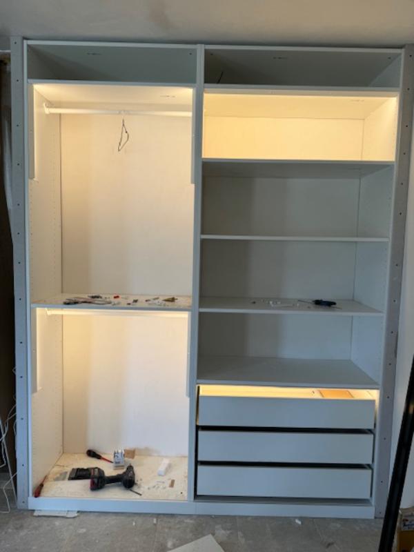 De inbouw kast die we hebben laten overkomen is eerst aan de beurt. Deze wordt eerst helemaal op maat gemaakt door manlief en is voor de extra ruimte.