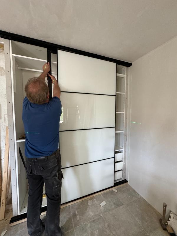 We slepen de inbouw kast onderdelen naar vanuit de garage naar boven en gaat manlief aan de slag. De kast krijgt steeds meer vorm. Maar werkelijk elk onderdeel moet worden verzaagd om de boel pas te krijgen.