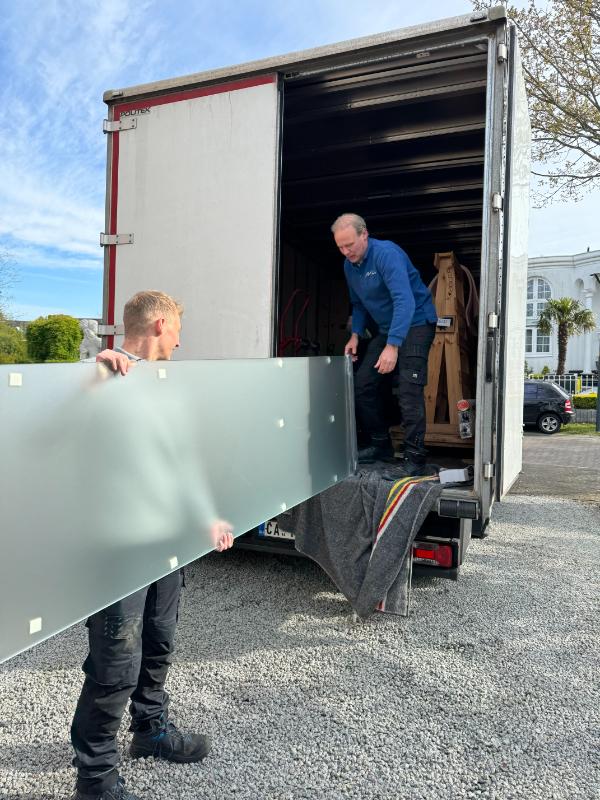 De glaswand die we in Nederland hebben besteld staat inmiddels op de meegeleverde bok van het bedrijf in de vrachtwagen.