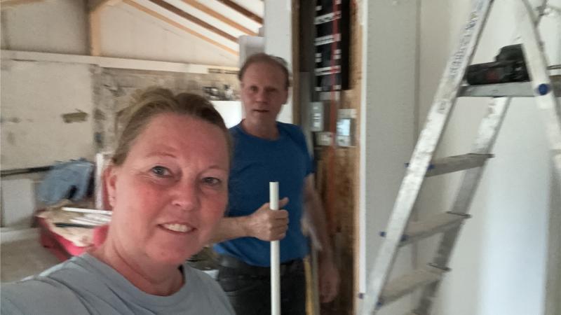 Ook maakt manlief nog even een aansluiting aan de buitenkant van de zijgevel, zodat hij zijn auto eindelijk normaal kan opladen, zonder dat er overal snoeren door het hele huis, veranda en de tuin lopen.