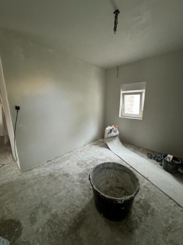 Dat blijkt een verstandige keuze. Want als ik na een tijd een kijkje neem in onze slaapkamer zie ik een grote ravage. Gelukkig smeert hij de muur weer aan en zo lijkt het allemaal al weer heel wat.