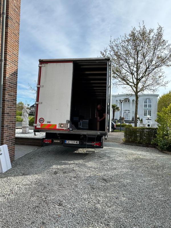 Het personeel van Heemskerk besturingstechniek verhuis bedrijf laadt de spullen in de vrachtwagen. Het tempo zit er lekker in en binnen no time staat alles in de vrachtwagen.
