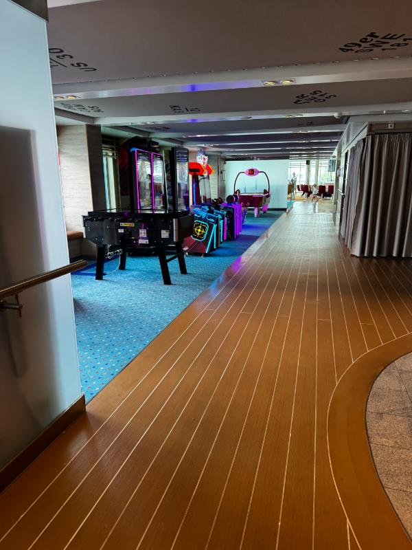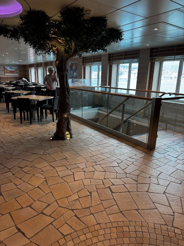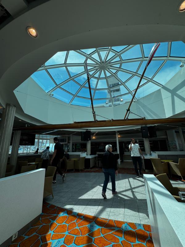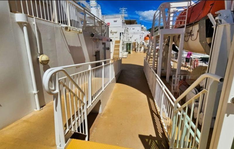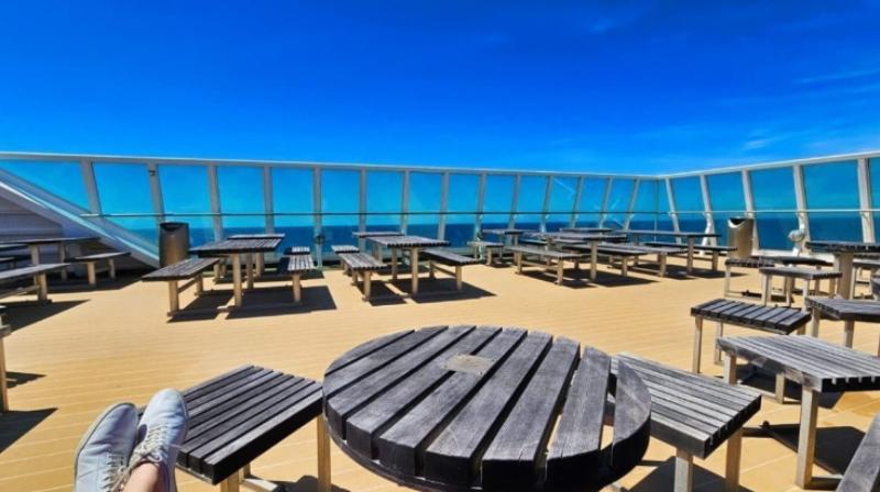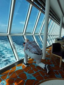 Als we op het dek aan boord zijn, zeg ik tegen mijn schoonmams dat ik even een sprintje trek naar het mooiste plekkie van de boot. (het panorama dek).