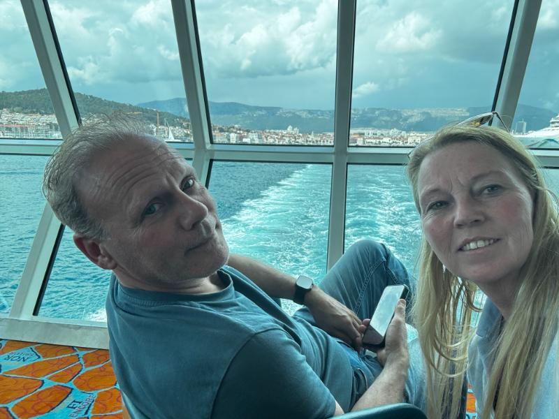 De ferry zit behoorlijk vol. En al die rennende schreeuwende koters geven me nou niet echt een vakantie gevoel.