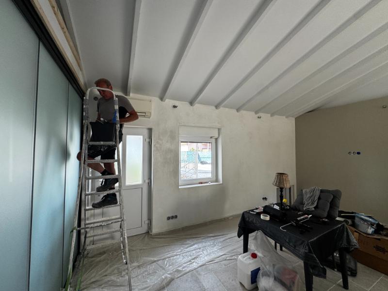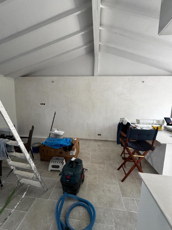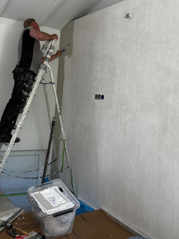 Manlief gaat door met het repareren en glad maken van de andere muur. Eentje waar nog een hoop werk in zat.