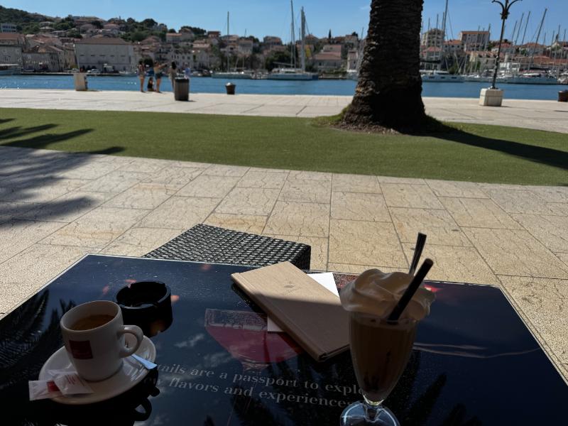 Eenmaal aangekomen in de haven parkeren we de auto alvast in de rij voor Stari Grad. En hoewel we erg vroeg zijn is dat geen probleem en kunnen we op ons gemakkie een terrasje pakken bij Terminal F (zie bijgevoegde tripadviser link) op loop afstand van de haven.