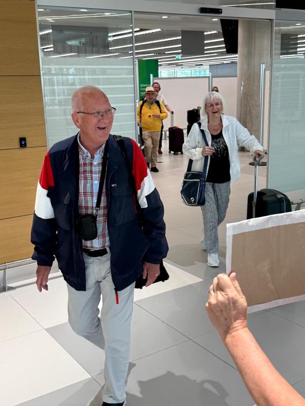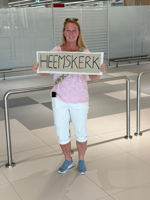 Vervolgens gaan we naar de aankomst hal en wachten we ze daar op als echte gidsen. (we hebben het uiteraard professioneel aangepakt). Tot onze grote hilariteit kijkt zelfs een andere gids op ons bord om te zien wie wij ophalen. Heey kom niet aan mijn gasten lijkt hij te denken.