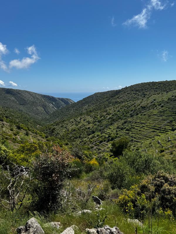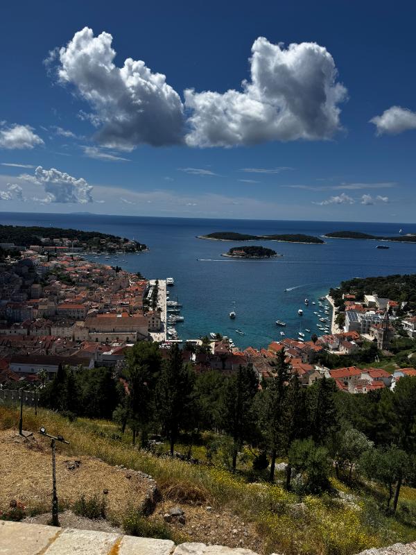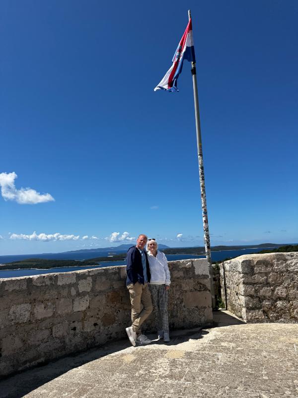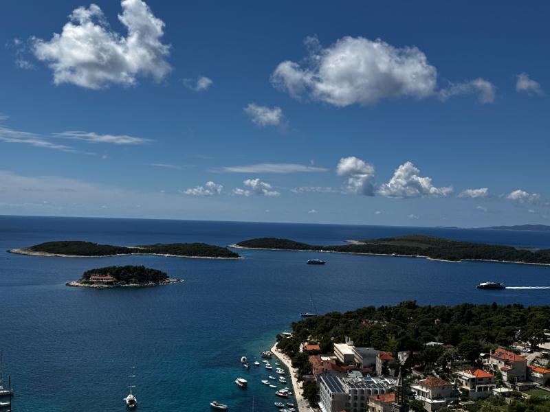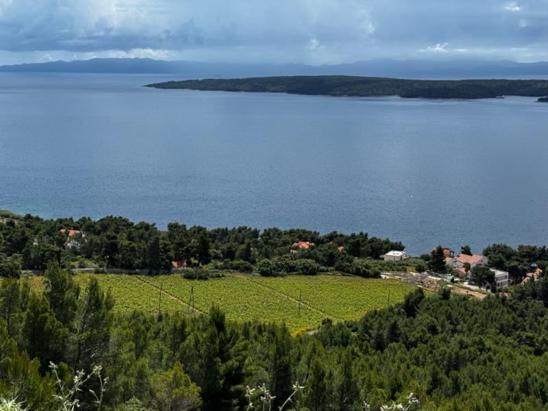 We staan nu op een van de hoogste punten en vanaf hier zie je het Spaanse fort heel goed liggen. Maar ook kijken we hier vanaf een nog hoger punt uit over de Pakleni eilanen en het eiland Vis.
