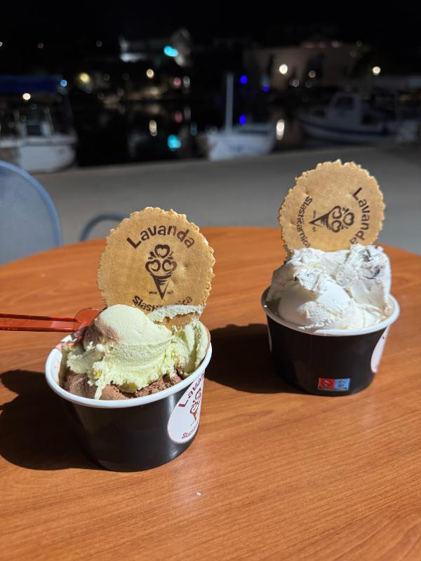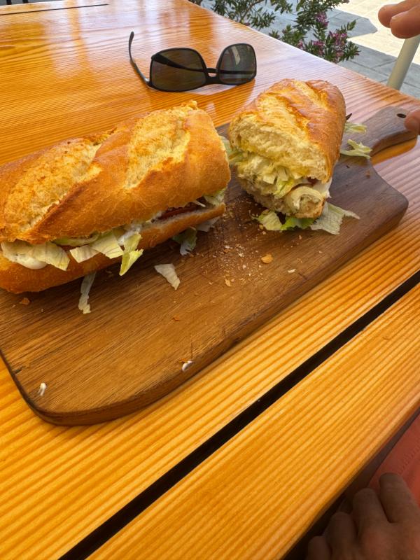 Met de auto vol luchtbedden die het water niet geraakt hebben rijden we naar Jelsa en zien we een broodjes bar. Iets wat ons voorheen nog niet was opgevallen. Geen idee waarom ? We zijn allebei verbaasd. Maar misschien hebben ze ineens een bord met sandwiches erop, geen idee ?