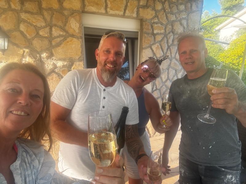 Terwijl we na een dag hard werken even zaten uit te puffen hoorden we de Broaten aan komen lopen met.., jawel, champagne incl. champagne glazen, om dit heugelijke moment met ons te vieren en te proosten.