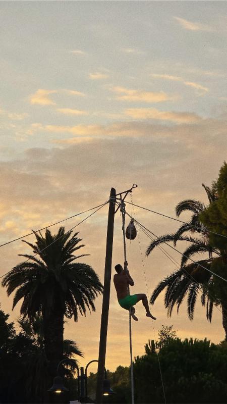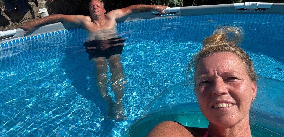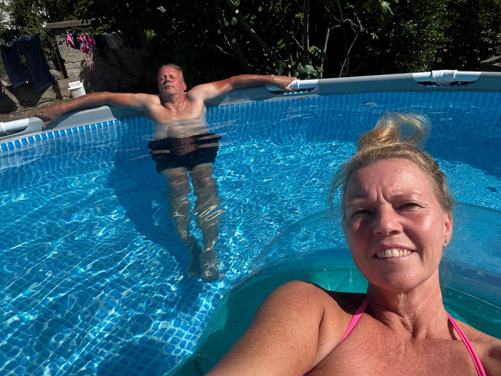 Als iedereen het bad heeft verlaten en ik de laatste sprinkhaan van mijn luchtbed heb verwijderd, kunnen we eindelijk zelf genieten van de verkoeling. Met een meezingertje aan de zon aan de blauwe lucht, weten we het zeker. Dit is thuis !