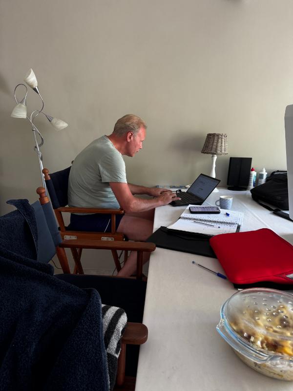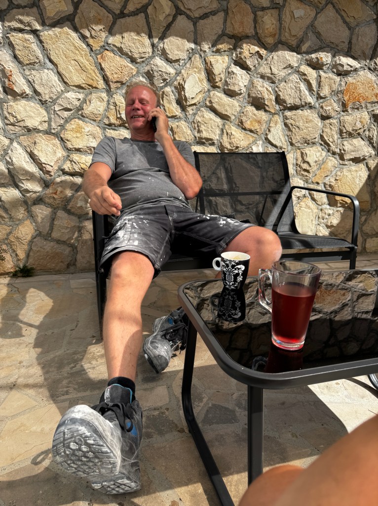 De telefoontjes houden nog steeds niet op. Makelaars, notarissen, adviseurs maar ook het werk. Iedereen wordt beantwoord en er wordt nog steeds van alles geregeld tussen het klussen en genieten door. Los van alle vragen en mailtjes blijven we lachen en genieten we van een bakkie in de zon bij ons op het terras.