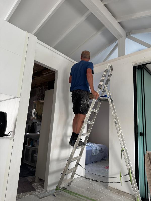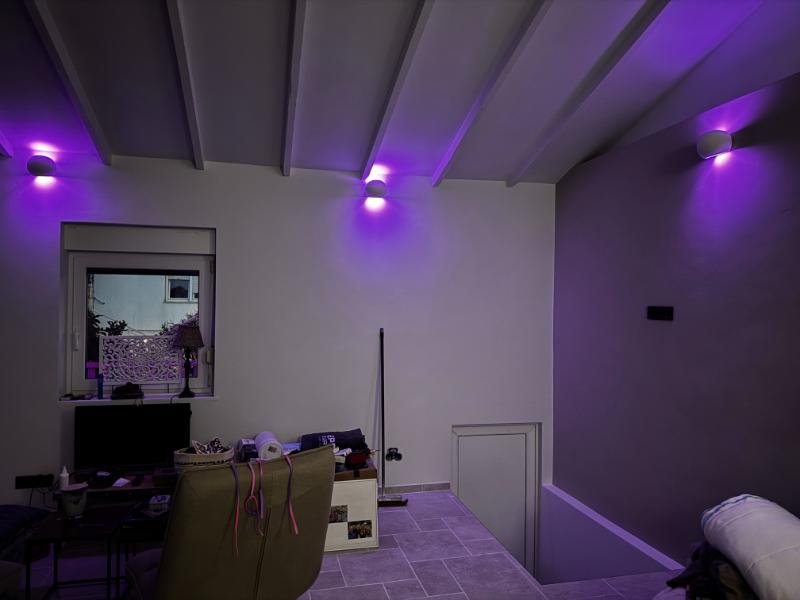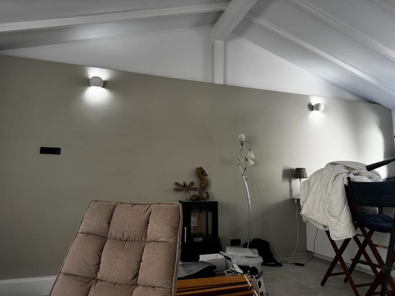 De dagen erna wordt er geschilderd en de muurlampen gemonteerd. Dit ziet er gelijk gezellig uit, vooral omdat je zelfs de kleur kunt instellen via wifi.