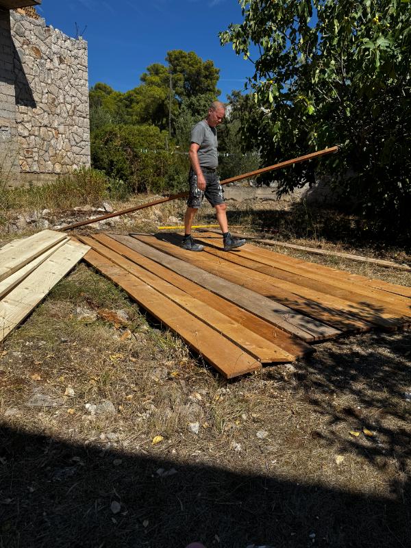 We kijken wat we aan hout hebben liggen en komen tot de conclusie dat we nog meer hout moeten bij halen.