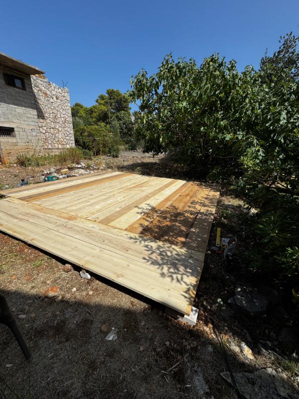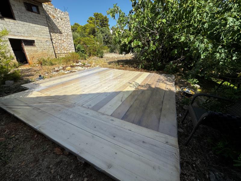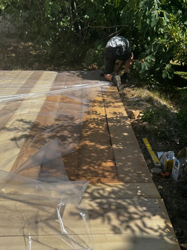 De dagen zijn heel warm als we in de tuin bezig zijn om een mega vlonder te timmeren.