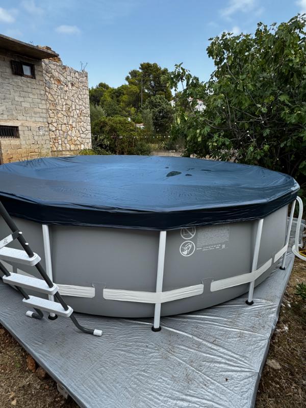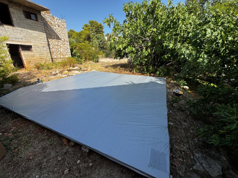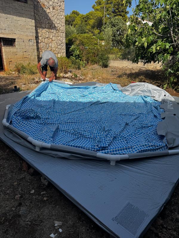 Het zeil gaat over het zwembad zodat we geen dode beesten zullen aantreffen in december. Of ongenodigde gasten zonder zwemdiploma dood aan zullen treffen.