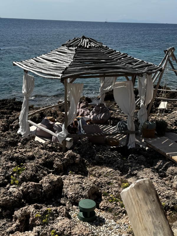 Er zijn mensen aan het zwemmen en er zitten wat mensen buiten. Er is op dit moment geen massa toerisme meer. Maar vraag me niet hoe het er in augustus is ?
