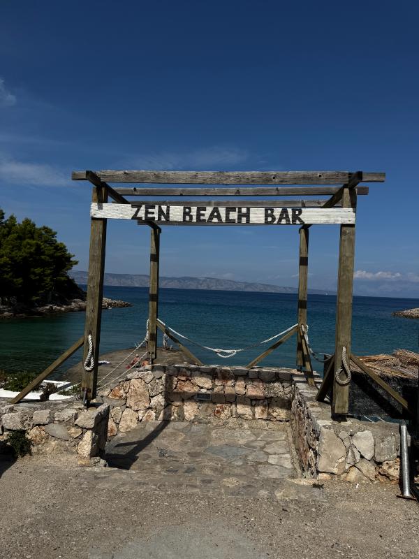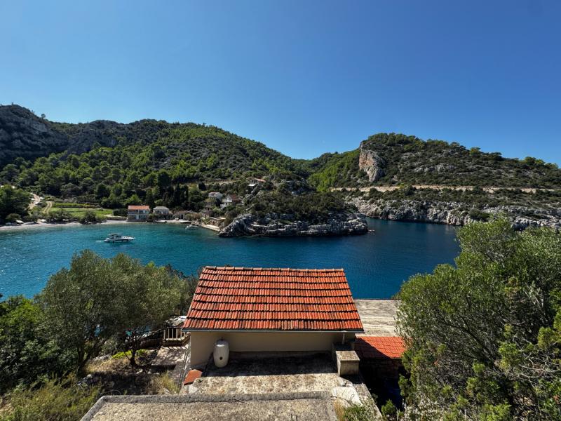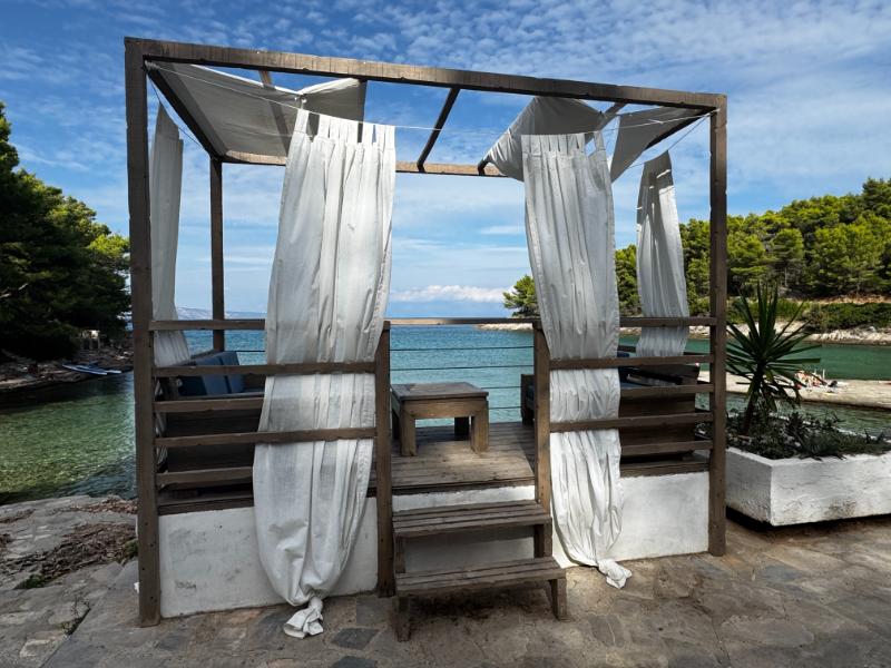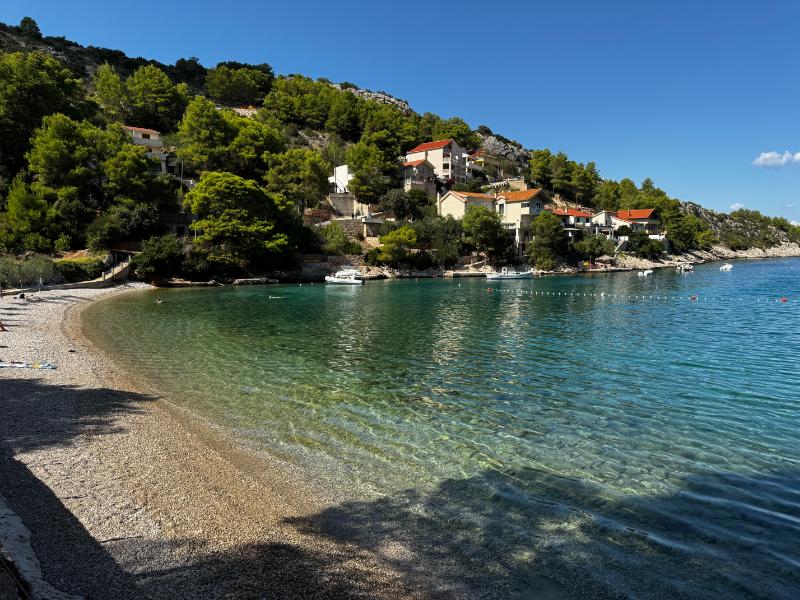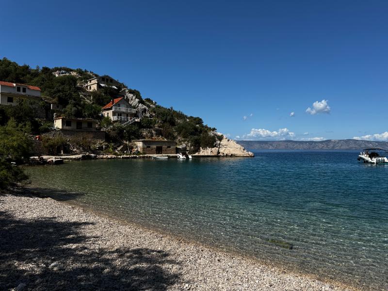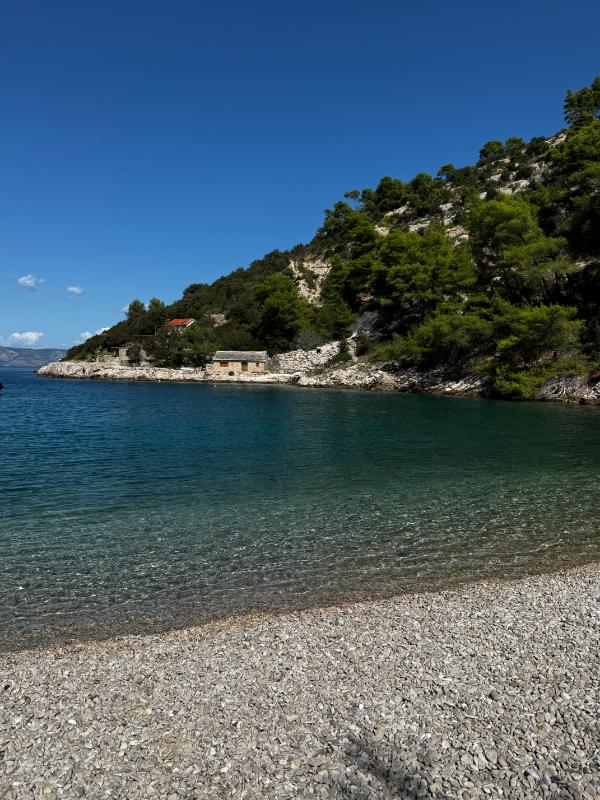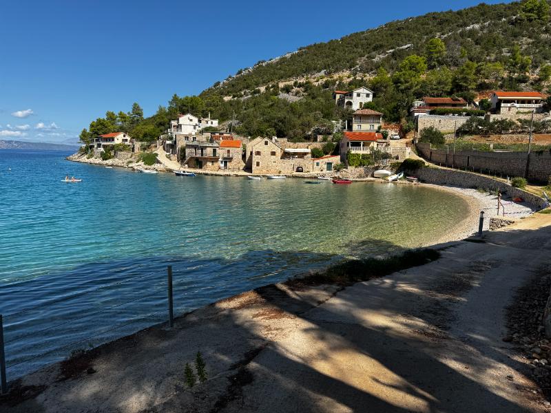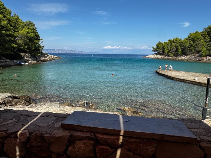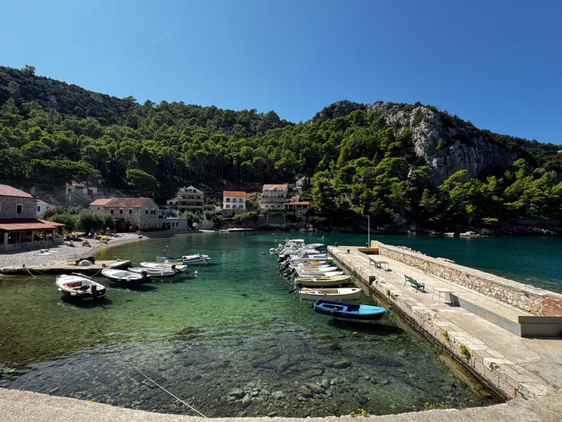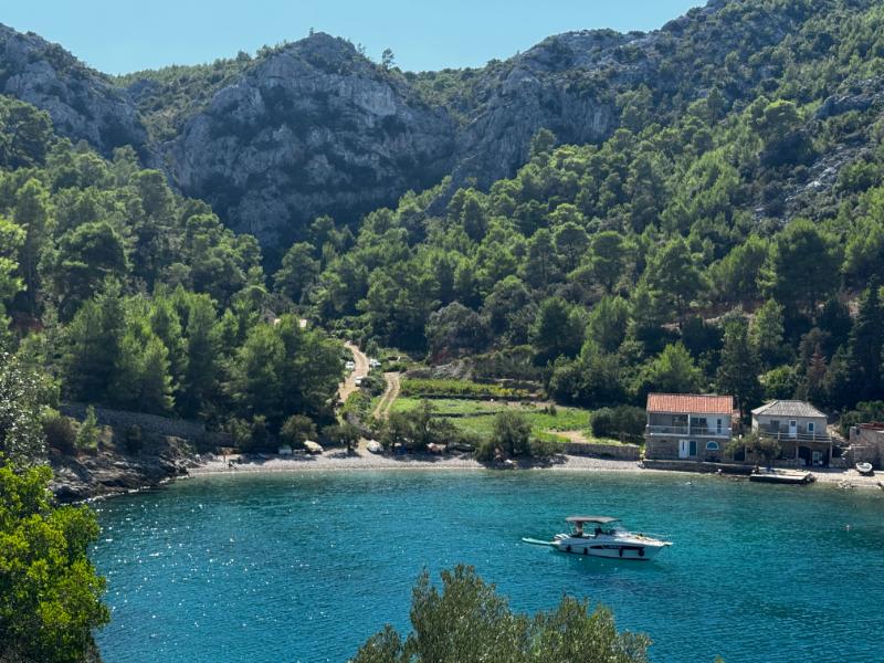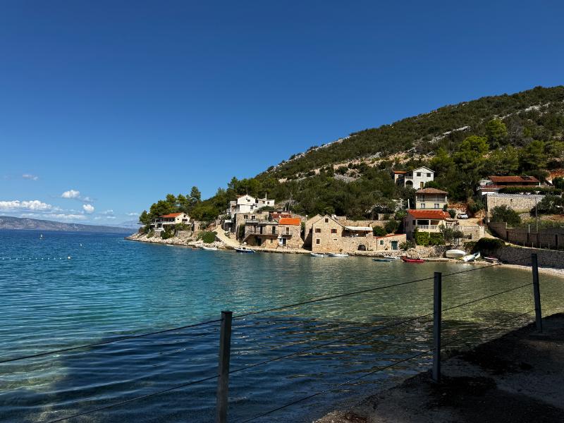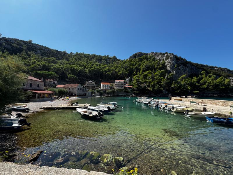 Onze eerste stop in in een pittoreske baai, waaraan wat huizen staan en zelfs een restaurant is. Het heet Vela Stiniva. Het is een kleine pittoreske baai met wat huisjes een kerk en zelfs een restaurant.