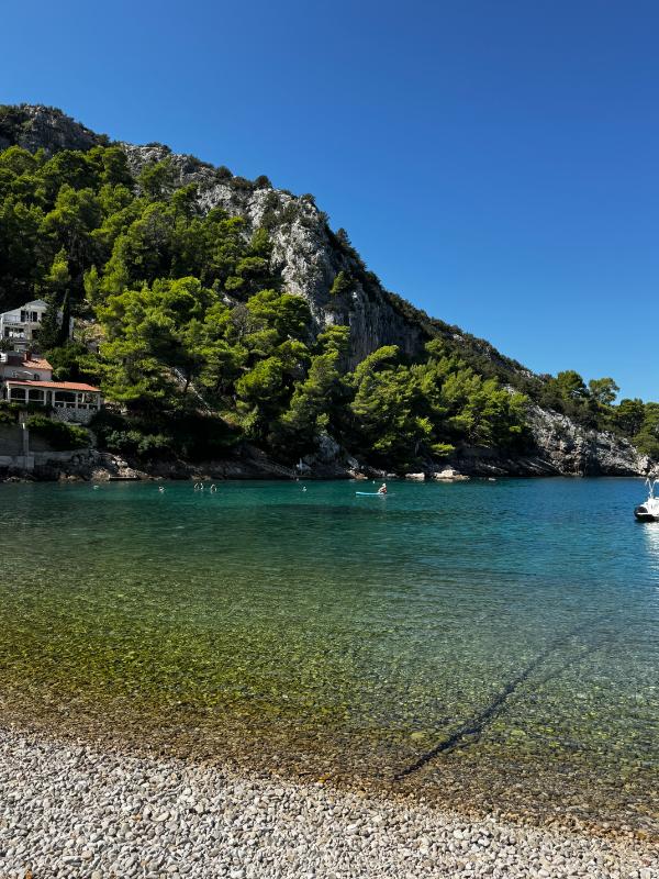 Dit smaakt naar meer en omdat we ook hadden gelezen over mala Stiniva besluiten we door te rijden. Met de onaangetaste luchtbedden gaan we verder op pad. De rit is prachtig. Je hoort de krekels en ruikt de geur van de bomen. De weg is adembenemend mooi.
