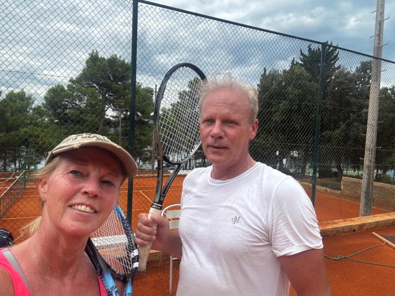 We fietsen naar de tennisbaan de volgende ochtend met rackets en ballen in de tas. Eenmaal op de tennisbaan beginnen manlief en ik rustig aan.